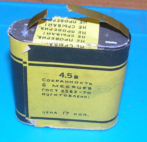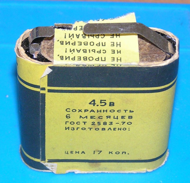 Батарейка была неповреждённая, полностью высохшая как мумия, но при этом подавала признаки жизни: на нагрузке 10 МОм (мультиметр RICHMETERS 109) выдала ЭДС 4в, правда при нагрузке в 1 МОм (мультиметр DT838) напряжение упало до 2в. Совсем неплохо для 50-летнего возраста.