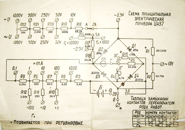 Как видим, и пределы измерений Ц-437 выбраны более удачными – при пересчёте показаний его шкалы максимальный множитель (или делитель) равен 2, а в Ц-20 – 4. И максимальные пределы больше до 1000 В (600в у Ц-20) и 1000мА (750 мА у Ц-20).