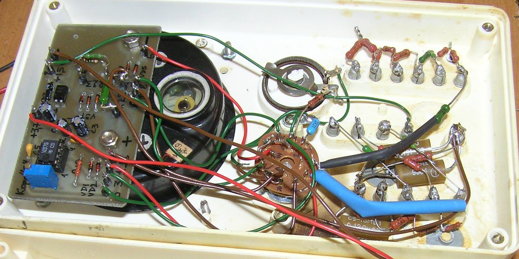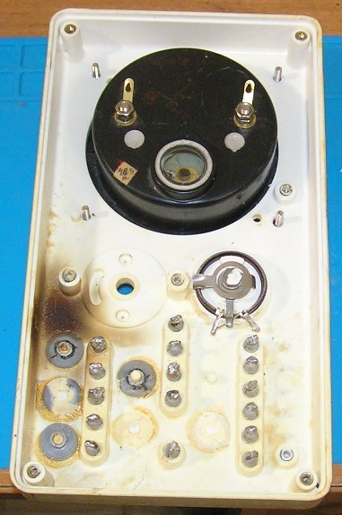 Поэтому было решено в корпусе Ц20 разместить внутренности Ц20-05, взяв за основу схему второго варианта (того, что без переключателя пределов омметра). Поскольку переключатель режимов у Ц20 галетный, а число гнёзд меньше, схема Ц20-5 была соответствующе переделана.