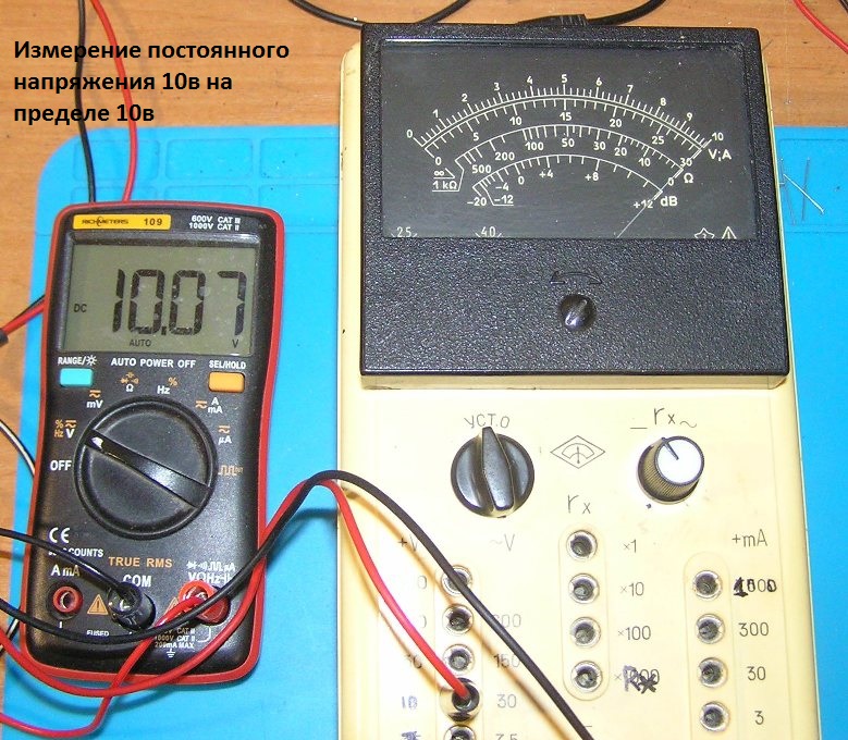 Для проверки я применил в качестве контрольных мультиметры фирмы RICHMETERS 109, 408B и магазин сопротивлений Р33. Полностью результаты измерений представлены на форуме. А здесь я покажу только часть измерений постоянного напряжения 10в на пределах 10,30 и 100в, демонстрирующую высокую линейность измерительной головки на всей длине шкалы.