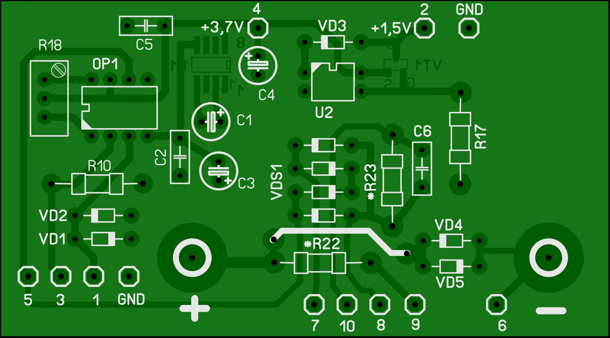 Основная часть деталей схемы размещается на печатной плате, которая крепится прямо на измерительные клеммы головки. Чертёж печатной платы в формате layout6.0 можно скачать на форуме.