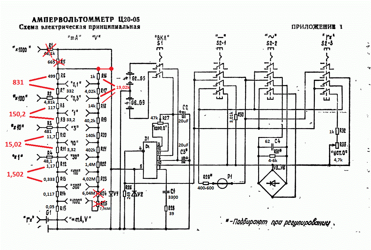 Всем хороша головка Ц20-05 и размеры её подходящие, но её полный ток отклонения 150 мкА, а у родной головки Ц20 – 85 мкА, почти в 2 раза меньший и просто так заменить её не получится, увы. Можно конечно сделать полный пересчёт и переделку всех резисторов делителей и шунтов, но тогда придётся отказаться от столь удобной для пользования шкалы, что совсем неприемлемо.