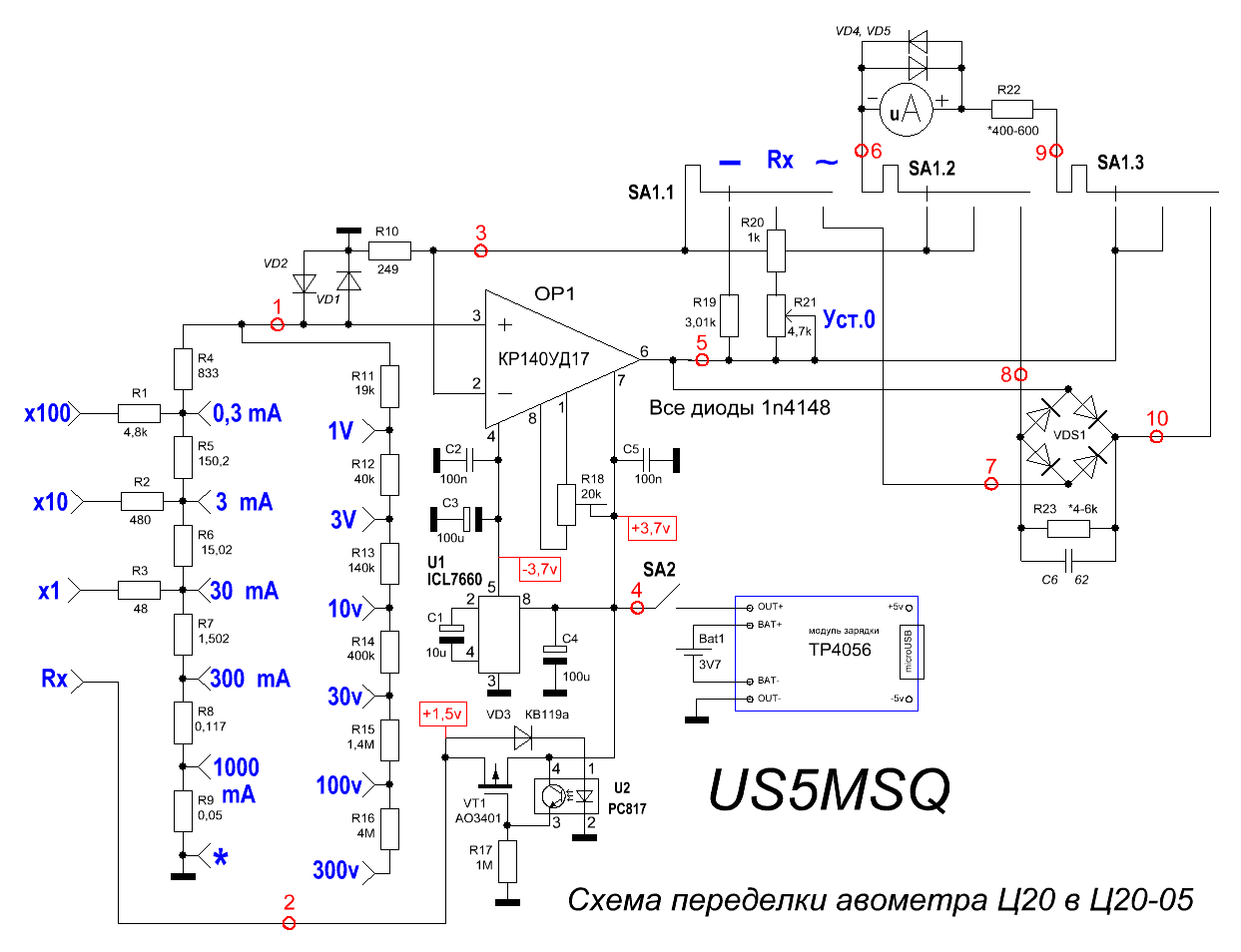 Перед первым включением располагаем прибор горизонтально и вращая отверткой корректор механически устанавливаем стрелку измерительной головки в нулевое положение. Внимательно ещё раз проверяем монтаж и затем включаем питание. Сначала проверяем напряжения на выводе 7 ОУ (вывод 4 платы) должно быть положительное напряжение аккумулятора, а на выводе 4 ОУ — отрицательное напряжение примерно на 0.5в меньше положительного. На выводе 2 платы должно быть напряжение +1,5в. Общий ток потребления порядка 3 мА. Даже средненький аккумулятор емкостью 1200 мА обеспечиват непрерывную работу авометра примерно 400 часов! Затем вращая подстроечник R18 добиваемся на выходе ОУ(вывод 5 платы) нулевого напряжения – не больше 1 мВ, лучше меньше. Возвращаем приборв горизонтальное положение и проверяем точность установки стрелки в нуль при выключенном и включённом состоянии. При необходимости повторяем регулировку R18. Теперь при пользовании переделанным прибором следует руководствоваться инструкцией на авометр Ц20-05, которую можно скачать в ИНЕТе или у меня на форуме.